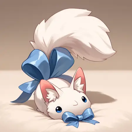 korsche,白色皮毛,无嘴巴,野性,蓝色丝带,尾巴,点状眼睛,樱桃尾饰