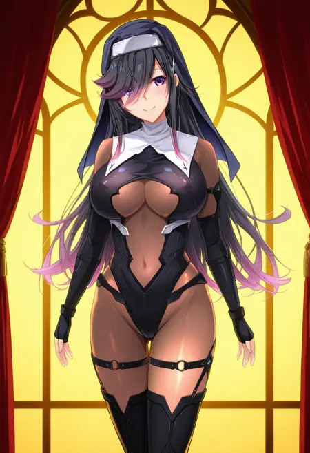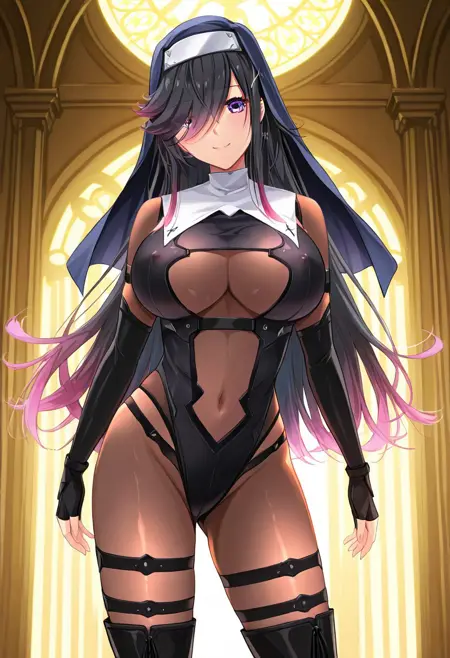 雪奈战斗修女服:SetsuNM,修女,暴露服饰,黑色紧身衣,棕色连体衣,中央开襟,无指手套,大腿绑带,大腿靴,黑色靴子,黑色手套,黑色肘部手套,遮盖肚脐,遮盖乳头