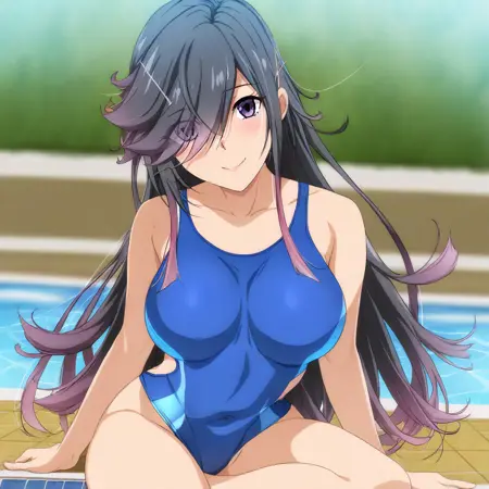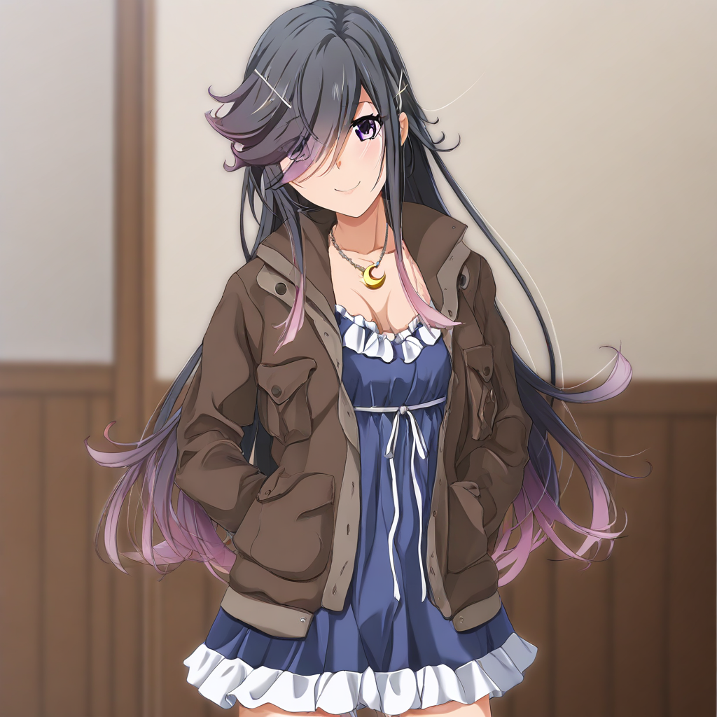 黑发,渐变发色,粉发,长发,凌乱头发,反卷发,发夹,发簪,鬓发,紫眼,头发遮住一只眼睛,发丝间可见眼睛