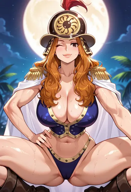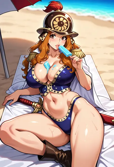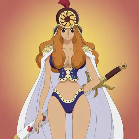 AphelandraOP, 1girl, ソロ, 极端に背の高い女性, 長い髪, 広い茶色の目, オレンジ色~茶色の髪, 唇, 大きな胸, 青いコルセット, 黄色で縁どられ、ボタンが飾られたコルセット, 胸元, 青いビキニパンツ, 白いマント, 広い臀部, へそ, お腹, 股間, 羽飾り付きモリオン型ヘルメット, 頬ガード, 濃い茶色のアウトドアブーツ, 剣, 鞘に入った剣, 背中に差し込んだ剣, 肩章, 鎖骨,