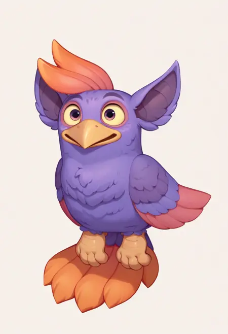 TweedleMSM, purple body, owl, ears, orange tips on head orange tips on butt, light yellow beak, light purple eyes, light green sclera, colored sclera, light yellow talons, no humans,