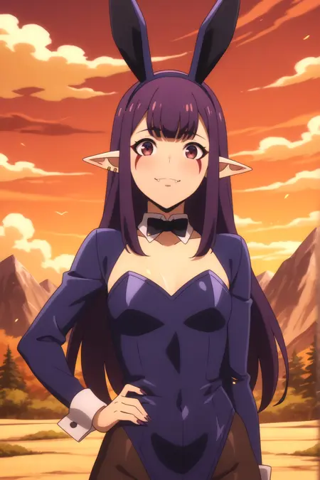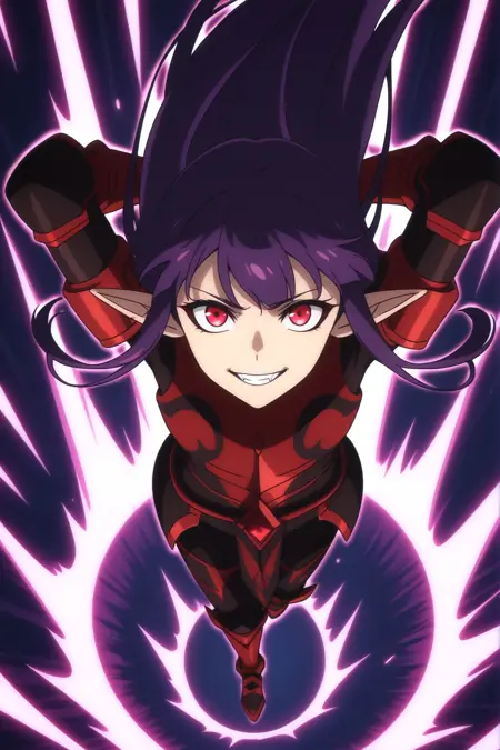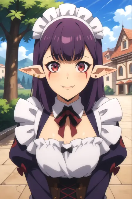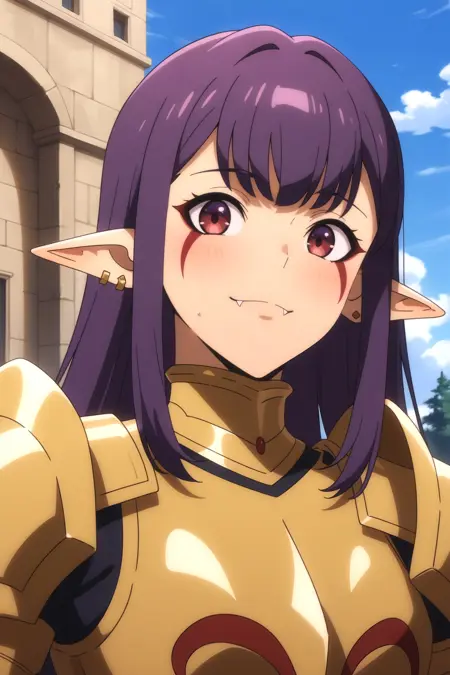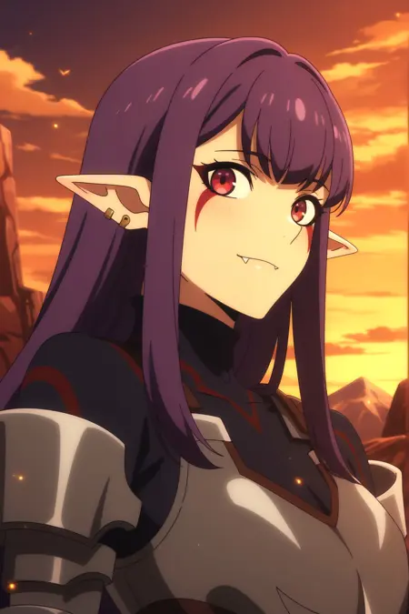 그림의 태그를 볼 줄 귀찮아하는 사람들에게 잘 작동하는 간단한 태그: Esil Radiru, 귀걸이, 뾰족한 귀, 보라색 머리, 붉은 눈, 송곳니, 얼굴 무늬. 이 태그들만으로도 캐릭터가 확실히 정확하게 재현된다.