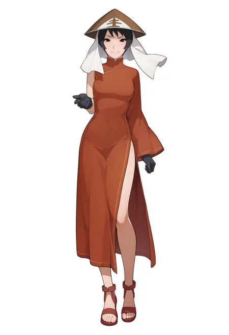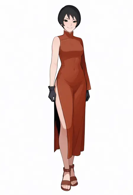 服装提示词:china dress, side slit, sandals, black gloves, single sleeve