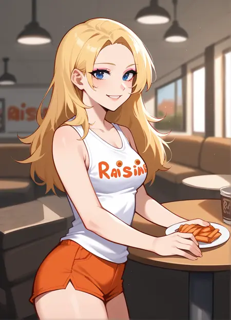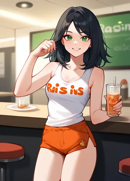 raisins uniform, tank top, orange shorts, makeup