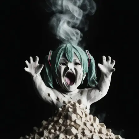 "A_sh Baby_ 또는 재로 이루어진 비명 지르는 아기 는 2022년 10월에 Reddit에서 처음 유행한, 재로 덮인 채 울고 있는 작은 아기의 AI 생성 이미지입니다. 이 이미지는 이후 2023년 초반에 TikTok 에서 여러 영상에 사용되었으며, 주로 TikTok 듀엣 와 관련하여 밝은 빛에 화상을 입는 사람들에 대한 반응 이미지 로 이용되었습니다."