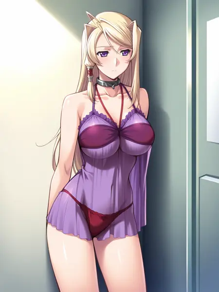 란제리: 보라색 네그리제, 투명, 빨간 브라, 빨간 팬티, 언더부브, 홀터넥, 칼라, 흉골