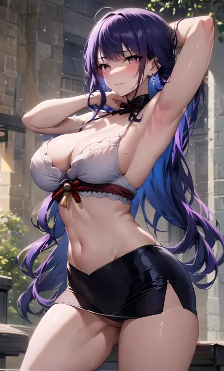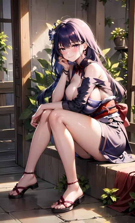 1girl,雷电将军,单独,长发,乳房,紫色头发,紫色眼睛,户外,看着观众,发饰,大腿,露肩,和服,刘海,腰带,和服,眼下痣,痣,闭嘴,腰带,长袖,脸颊红晕,乳沟,花朵,微笑,大乳房,流苏,赤腿,裙子,非常长的头发,紫色和服,膝盖抬起
