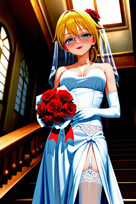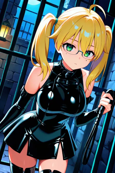 乳胶连衣裙:金发,双马尾,呆毛,绿眼睛,眼下痣,眼镜,发圈,双层领,露肩,乳胶连衣裙,乳胶长袖新娘手套,乳胶过膝袜,靴子,