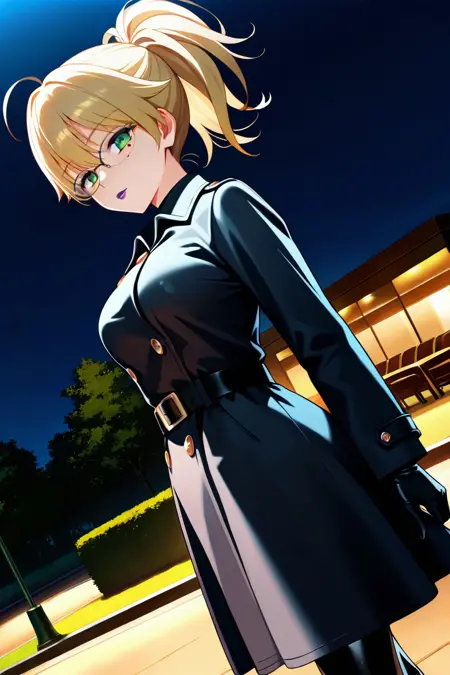 束缚装:金发,单马尾,呆毛,发带,绿眼睛,眼下痣,眼镜,紫唇,长外套,束缚装,服装剪裁,乳胶,束胸衣,肘部手套,露肩,露脐,乳胶内裤, straps,O形环,丝袜,高跟鞋