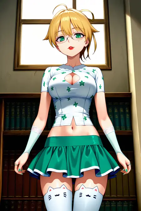 休闲装2:金发,单马尾,呆毛,发带,绿眼睛,眼下痣,眼镜,红唇,蝴蝶结,露胸剪裁,白色星星图案上衣,短袖,新娘式手套,指甲油,绿色指甲,肚脐,荷叶边裙子,猫式大腿袜,运动鞋