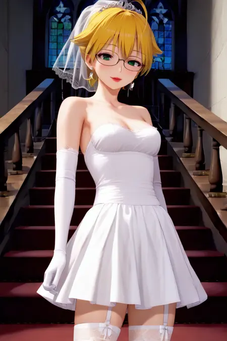 Latex dress : blonde hair,twintails,ahoge,green eyes,mole under eyes,glasses,hair tie,double collar,bare shoulders,latex dress,latex long bridal gauntlets,latex thighhighs,boots,