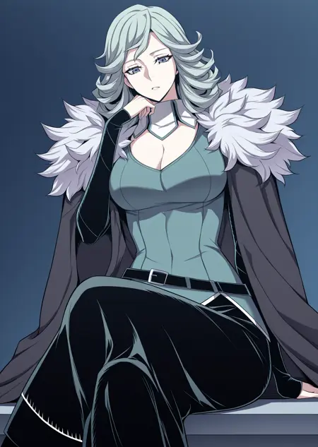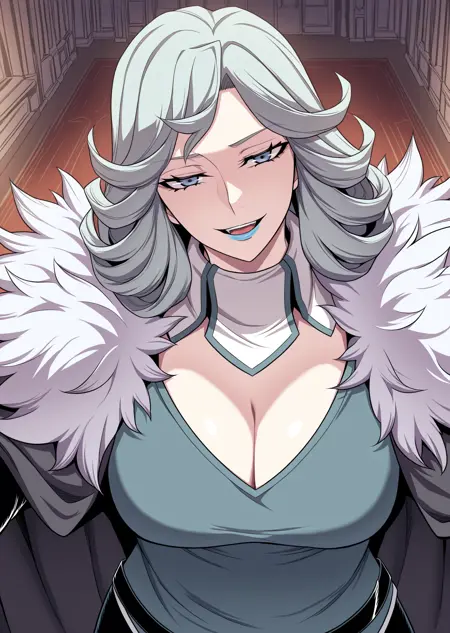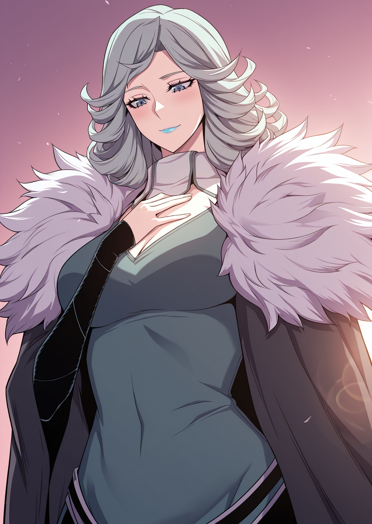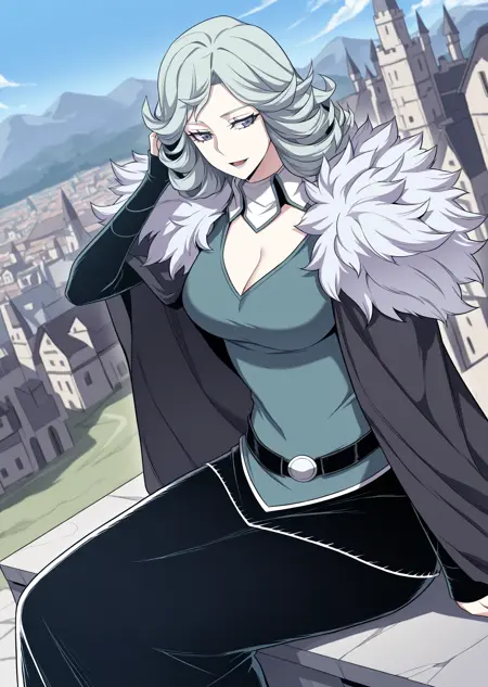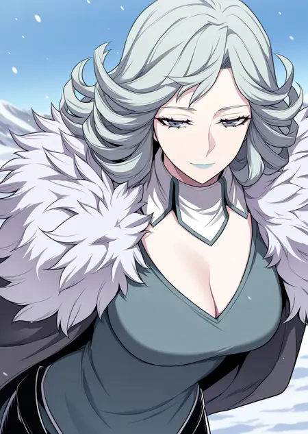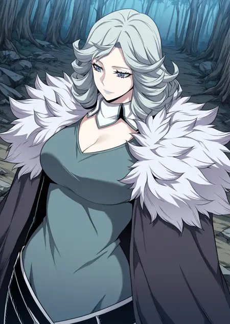 Elli_frost, white fur collar, fur trim, dark gray cloak, teal dress, long dress, black wide belt, round buckle, black skirt, white trim, long skirt, long sleeves, high collar, cleavage,