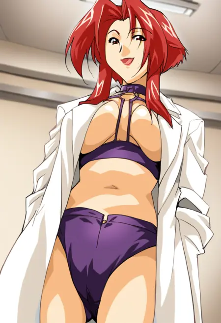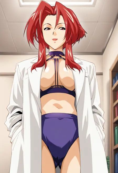 midorryouko, red hair female, large breasts, underwear, panties, labcoat