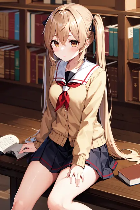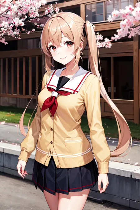 아우트핏3aamurasa, 긴 머리, 두 줄기 머리, 학교 유니폼, 흰색 선원 칼라, 빨간 넥커치프, 노란 카디건, 긴 소매, 검은 치마, 주름 치마