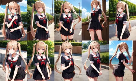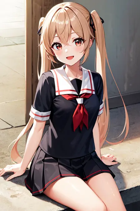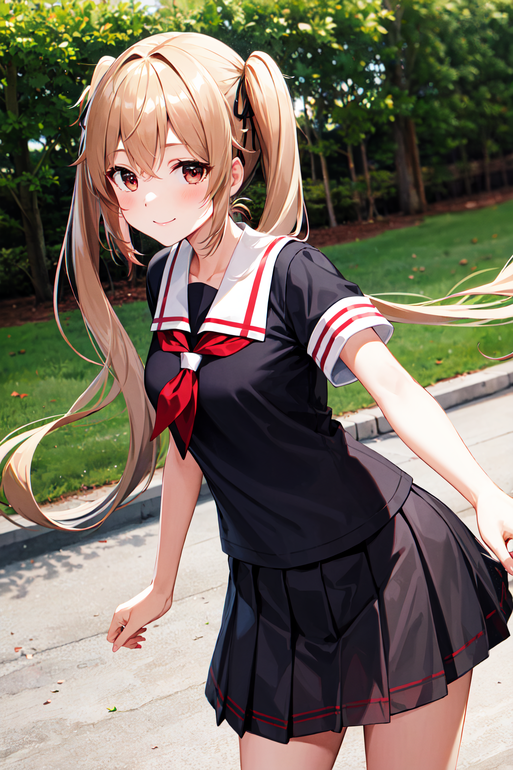 아우트핏1aamurasa, 긴 머리, 두 줄기 머리, 학교 유니폼, 흰색 선원 칼라, 빨간 넥커치프, 선원 셔츠, 검은 셔츠, 단팔, 검은 치마, 주름 치마
