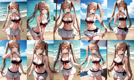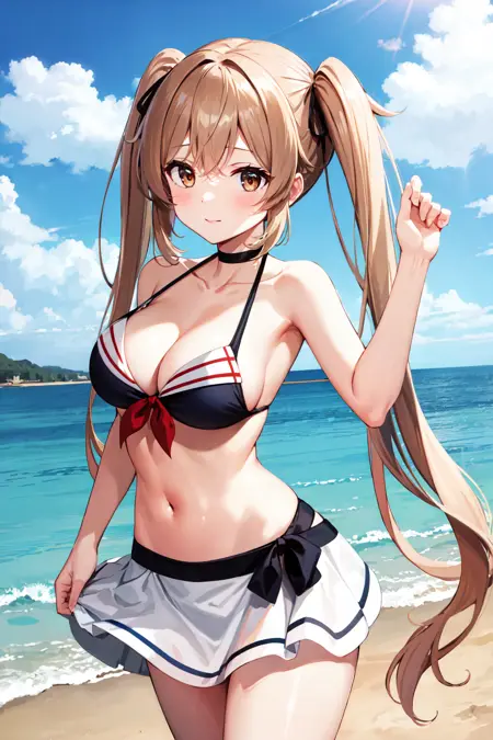 아우트핏2aamurasa, 긴 머리, 두 줄기 머리, 중간 크기의 가슴, 젖가슴, 선원 비키니, 검은 비키니, 비키니 치마, 흰 치마