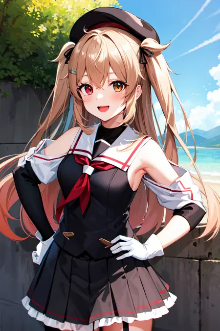 아우트핏4 (개이)bbmurasa, 긴 머리, 양쪽 위로 올린 머리, 머리 날개, 머리핀, 모자, 검은 머리장식, 이색안색, 붉은 눈, 갈색 눈, 흰색 선원 칼라, 빨간 넥커치프, 검은 셔츠, 분리형 소매, 흰색 벨트, 검은 치마, 게터 스트랩