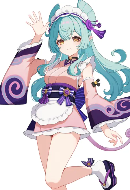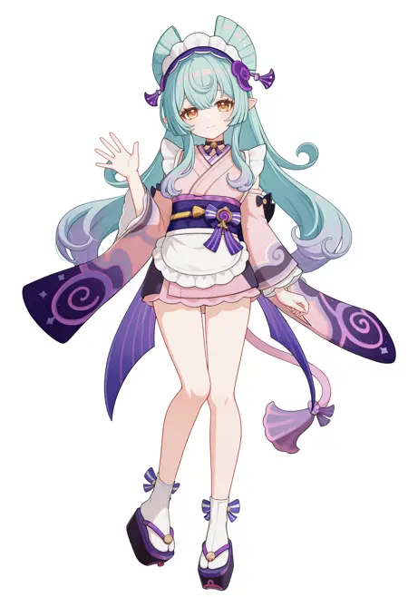• tail,apron,kimono,detached sleeves,wide sleeves,waist apron,pink kimono,obi,sandals,hair ornament,wide sleeves,choker,white socks,short kimono,platform footwear