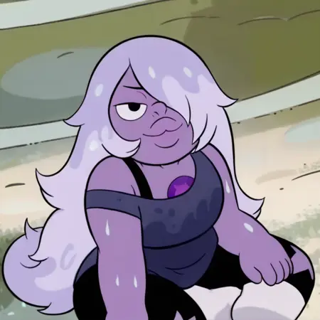 아메시스트: 보석, 하얀 머리, 긴 머리, 보라색 피부, 눈 위의 머리카락, 흰색 상의 또는 검은색 상의, 신발 또는 흰색 신발, 반바지 또는 회색 바지 또는 검은색 바지. 무기 트리거는 "채찍"