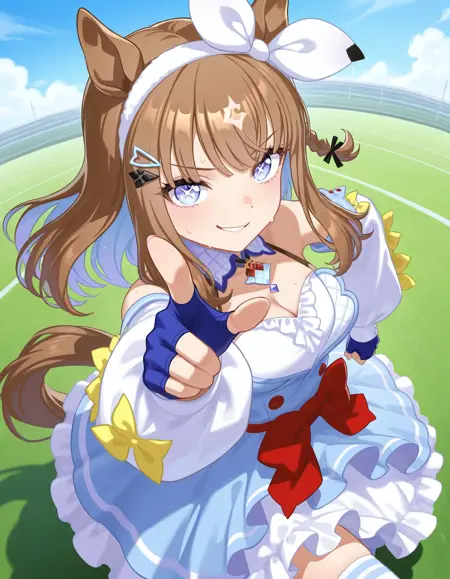 almond eye \(umamusume\), horse girl, horse tail, bow, hairband, hair ornament, hairclip, diamond hair ornament, dress, detached sleeves, cleavage, white thighhighs, fingerless blue gloves, long sleeves, white shirt, sleeveless, red bow, yellow bow,