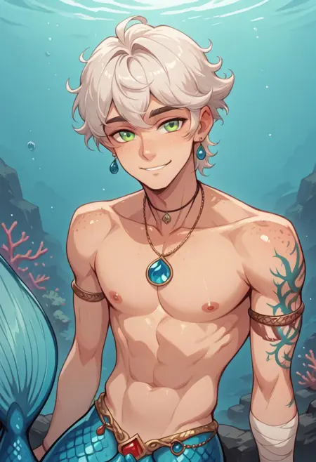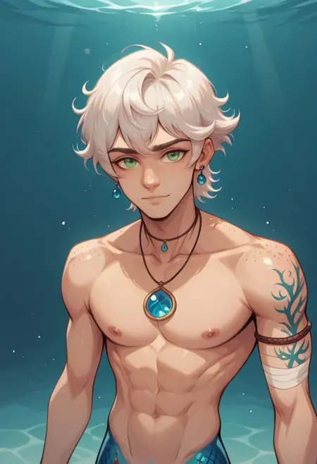 orion, quartermaster, melusine, mermaid, white hair, short hair, green eyes, freckles, head fins, scales, monsterification, topless male, pectorals, tattoo, armband, bandages, bandaged arm, necklace, tooth necklace, jewelry, earrings, mermaid tail, glowing,
