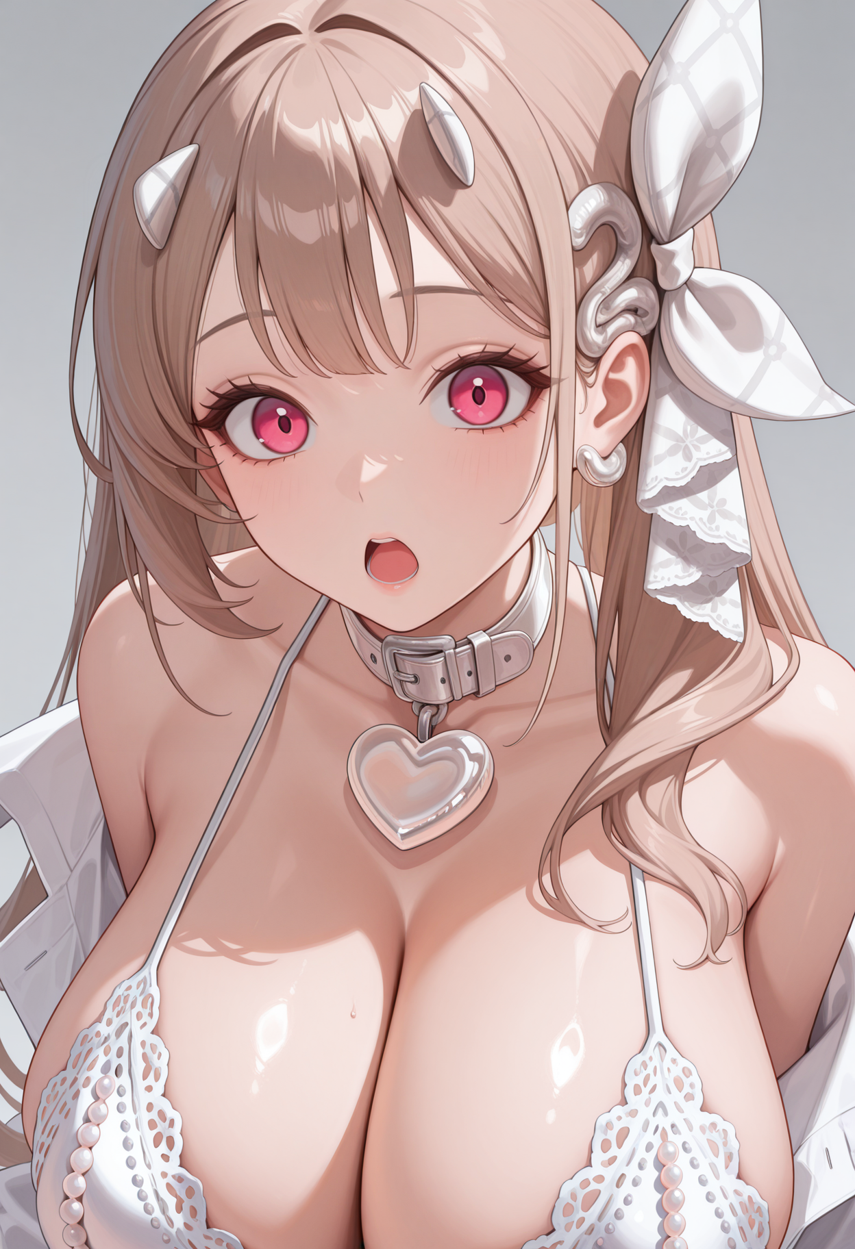 vprsm, 분홍 눈, 연한 갈색 머리카락, 긴 머리, 앞머리, 흰색 뿔, 흰색 장식, 머리장식, 머리 리본, 흰색 리본, 귀걸이, 흰색 칼라, 흰색 하트 펜던트, 큰 가슴, 가슴 노출, 흰색 셔츠, 칼라 셔츠, 어깨 노출, 흰색 비키니, 흰색 브라, 레이스 트림, 진주 비키니