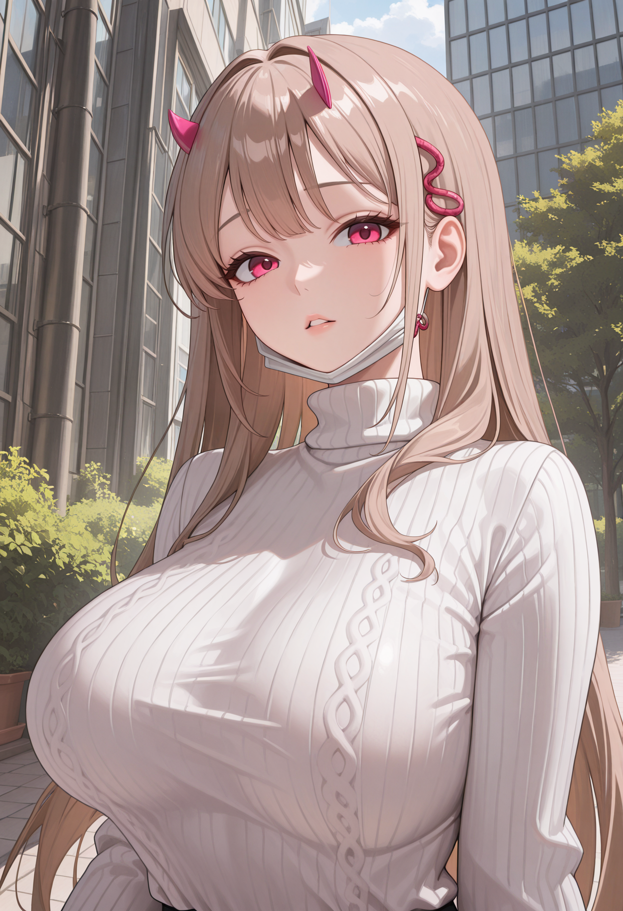 vprdef, 분홍 눈, 연한 갈색 머리카락, 긴 머리, 앞머리, 분홍 뿔, 머리장식, 분홍 장식, 귀걸이, 큰 가슴, 검은 목걸이, 분홍 하트, 팔 없는, 흰색 크롭탑, 복부, 배꼽, 가슴 절개, 화려한 치마, 체인, 피쉬넷, 손가락 없는 장갑, 흰색 장갑