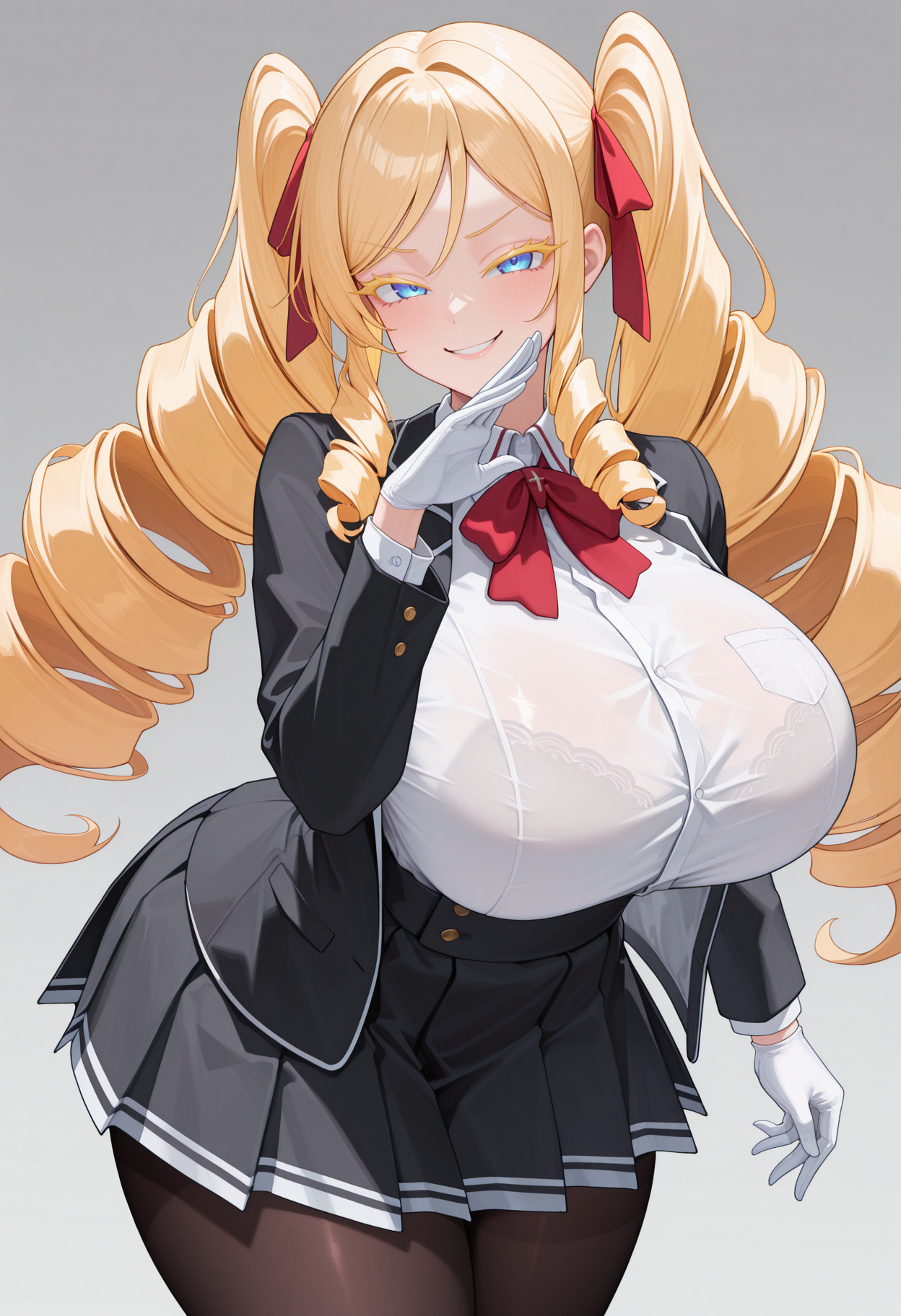 나나코, 파란 눈, 금발, 드릴 헤어, 트윈테일, 트윈 드릴, 긴 머리, 색상 아이브로우, 큰 가슴, 헤어 리본, 빨간 리본, 빨간 바이트, 학교 유니폼, 검정 재킷, 흰 셔츠, 칼라 셔츠, 플리츠 스커트, 검정 스커트, 흰 장갑, 검정 팬티스타킹, 곡선형 몸매