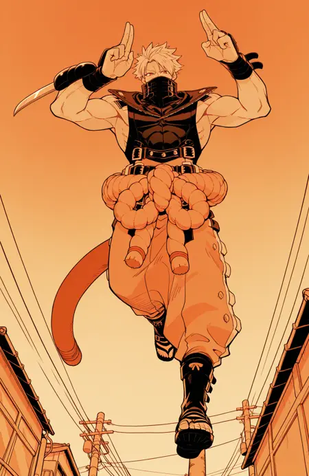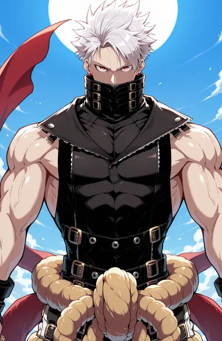 gg_zanuff, covered mouth, high collar, closed high collar, rope belt, baggy pants