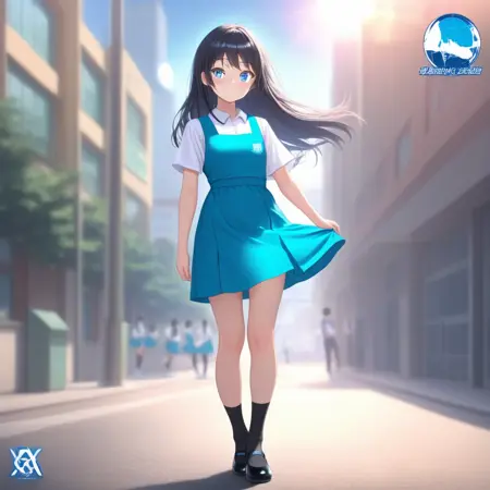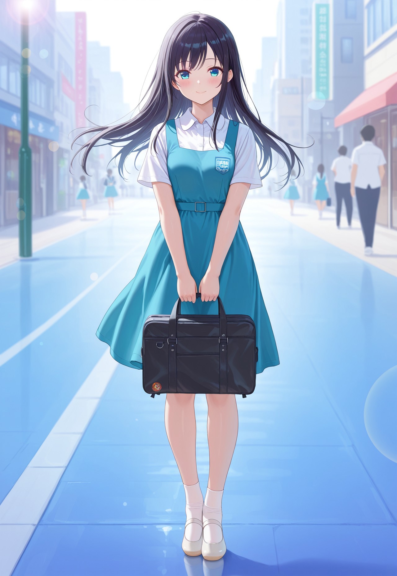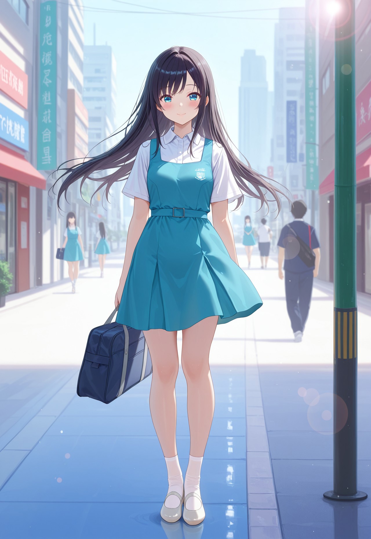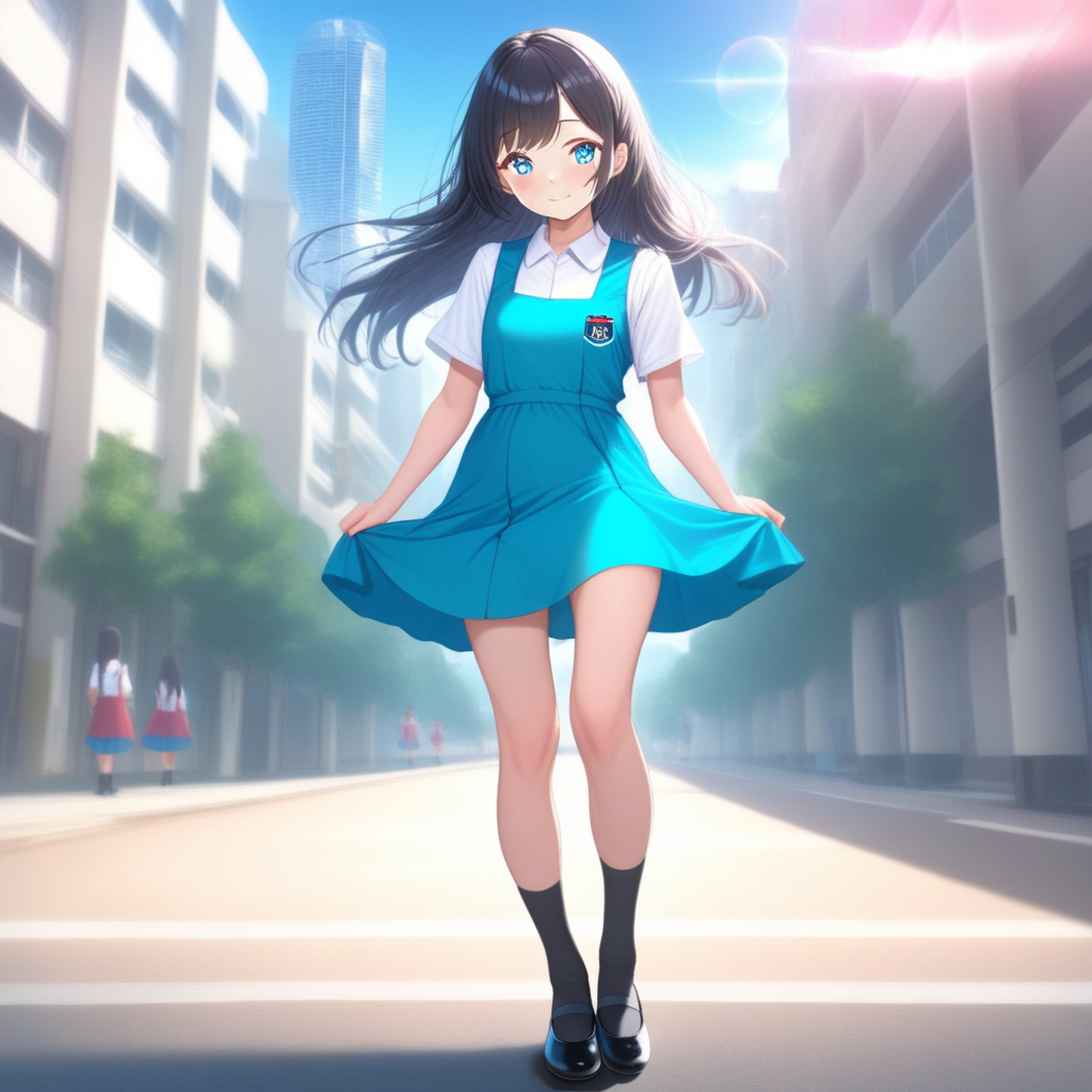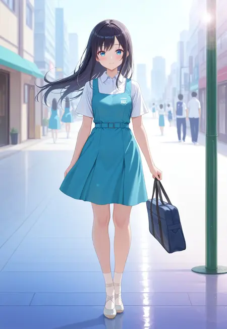(malaysian secondary school uniform),(pinafore dress),(aqua blue skirt),(blue pinafore),(collared shirt),(white shirt),(short sleeves),(white socks),(short socks),(white footwear),(ballet flat),