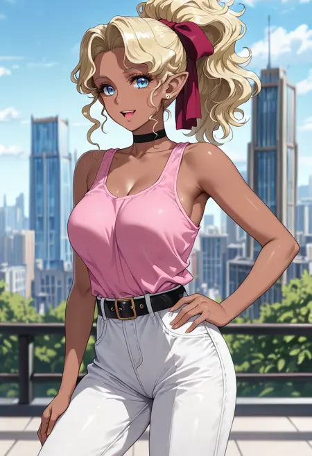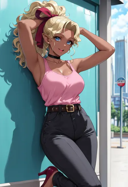 (蓝眼睛,金发,深色皮肤女性,尖耳朵,短发,睫毛,大头发,帘式头发,波浪发,卷发,耳环,钉状耳环,珠宝,红色发带,马尾:1.2),
