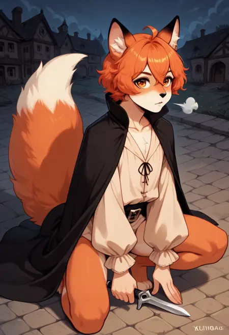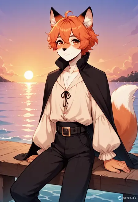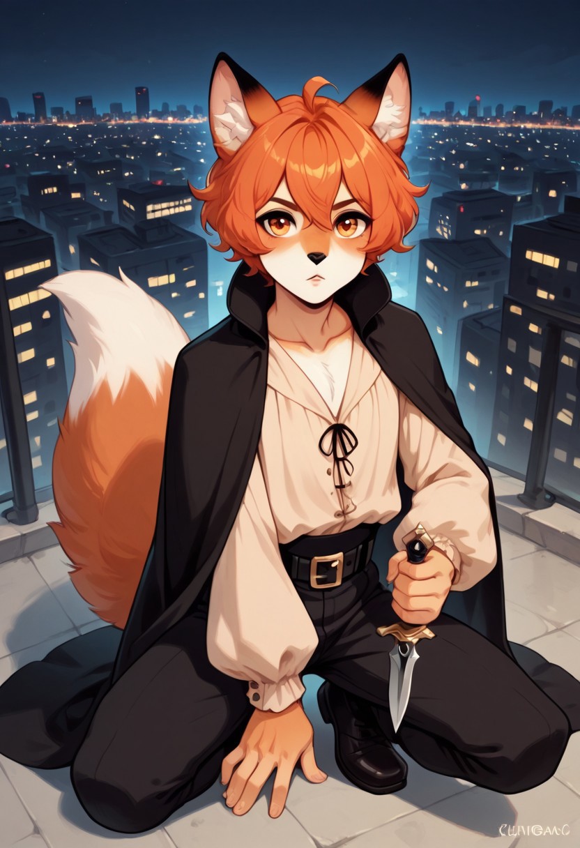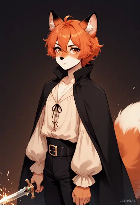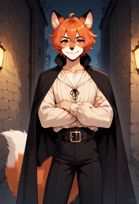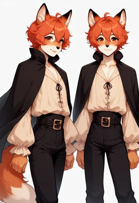 trixxx, mink, melusine, seductor spy, fox boy, orange hair, short hair, ahoge, hair between eyes, orange eyes, brown accents, animal nose, collarbone, femboy, male, fox ears, animal ear fluff, furry, tail, fox tail, white shirt, long sleeves, black cape, black pants, black leather belt, pants, belt, blush