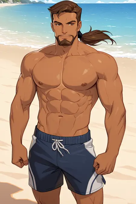 brown hair, ponytail, facial hair, beard, dark skin,