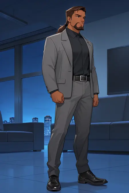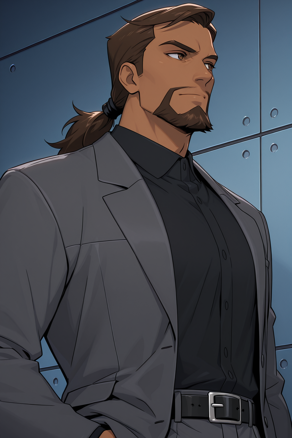 grey jacket, black shirt, belt, black pants