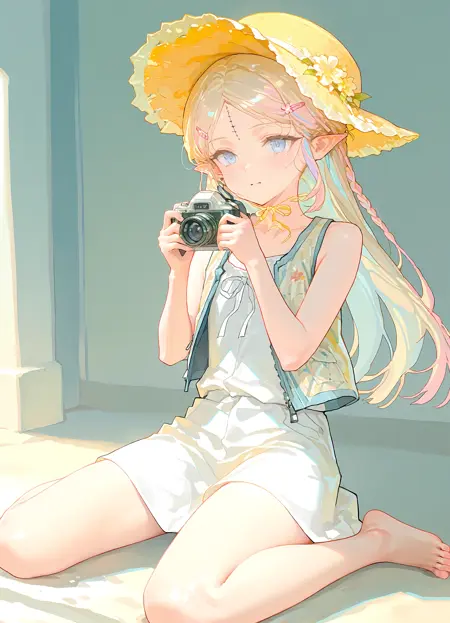 • 一周年中国限定线下活动皮肤 (链接): cartethyia \(cn1st\), 辫子, 黄色草帽, 粉色发夹, 背心, 白色连衣裙, 凉鞋, 相机, 肩包