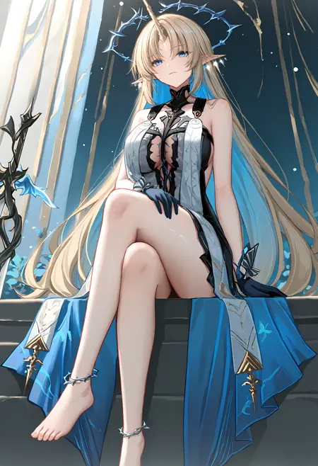 Fleurdelys: fleurdelys, circlet, single horn, earrings, single pauldron, single gauntlet, blue gloves, anklet