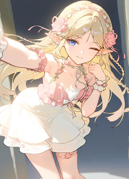 1st Anniversary KR (Korea) - Exclusive Offline Event Skin (link): cartethyia \(kr1st\), braid, flower hairband, earrings, frilled detached sleeves, single wrist cuff, pink frills, white dress, flower thigh strap, pink heels