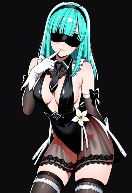 dflt outfit, black shirt, black skirt, skirt bow, side slit, juliet sleeves, feather-trimmed sleeves, cleavage cutout, turtleneck, black hairband, black blindfold, black thighhighs, black thigh boots, thighhighs under boots