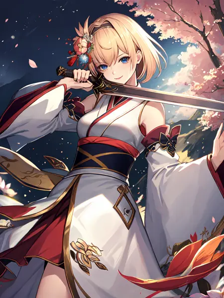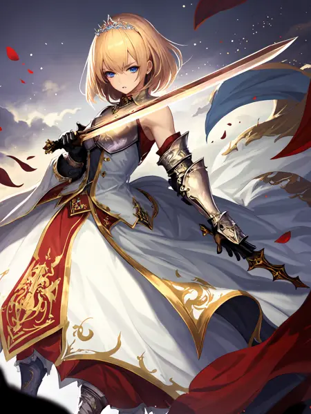 Default costume : White(and red) dress,armor,(breastplate),(forehead protector),(holding sword),bare shoulders,detached sleeves,gauntlets,armor ;
