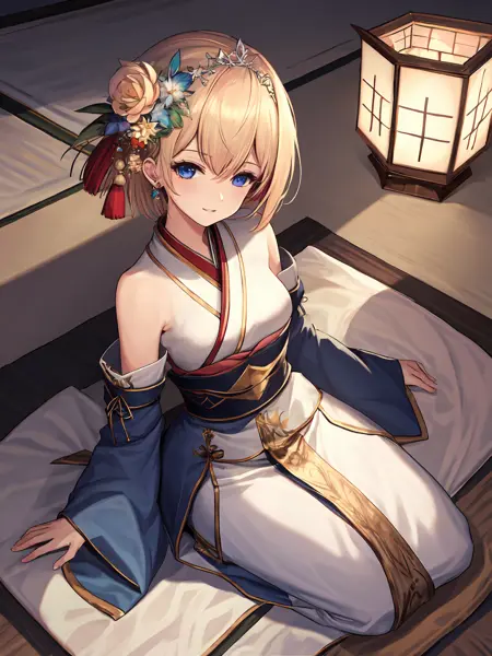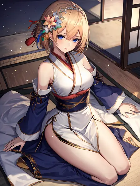 Basic : Blonde hair,hair ornament(hair band,hair flower),blue eyes ;