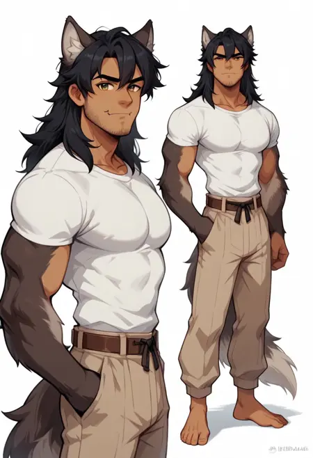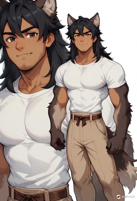 1소년, 남성 중심, 혼자, 늑대인간 맥스, 늑대 소년, 근육질 남성, 근육질, 바라, 검은 피부 남성, 검은 눈, 시청자 바라보기, 수염, 콧수염, 털날림, 동물 귀, 늑대 귀, 늑대 꼬리, 퓨리, 큰 가슴근, 가슴근, 덮인 복부, 검은 머리, 중간 길이 머리, 긴 머리, 흰 셔츠, 셔츠, 바지, 갈색 바지, 꼭 맞는, 벨트, 벌거벗은 발.