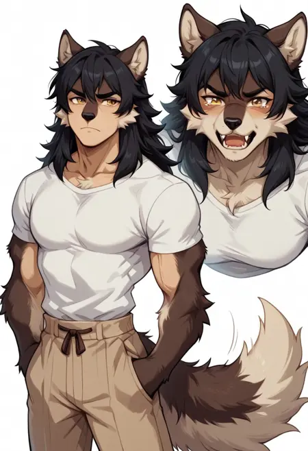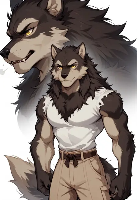 1소년, 남성 중심, 혼자, 늑대인간 알파, 늑대 소년, 퓨리 늑대, 변신, 근육질 남성, 근육질, 바라, 검은 피부 남성, 검은 눈, 노란 눈, 시청자 바라보기, 콧수염, 동물 귀, 늑대 귀, 늑대 꼬리, 퓨리, 몸 털, 큰 가슴근, 가슴근, 덮인 복부, 발톱, 송곳니, 검은 머리, 중간 길이 머리, 긴 머리, 흰 셔츠, 셔츠, 바지, 갈색 바지, 꼭 맞는, 벨트, 벌거벗은 발.