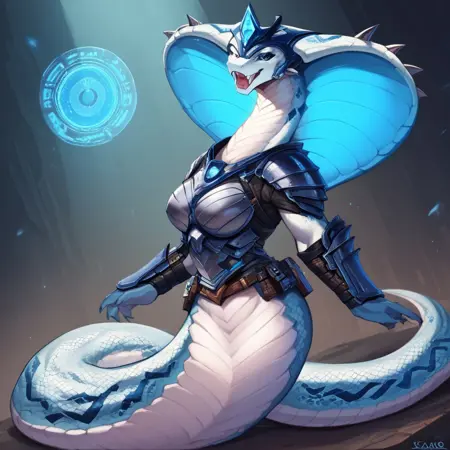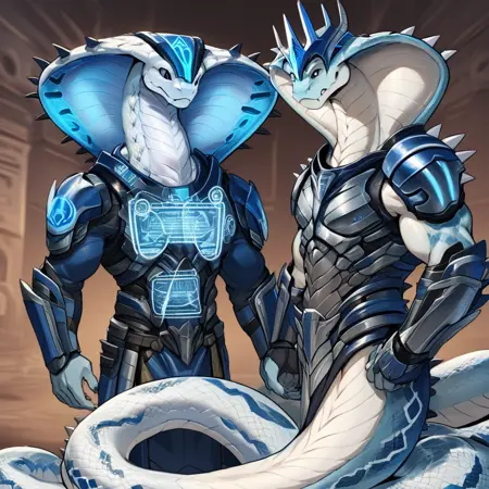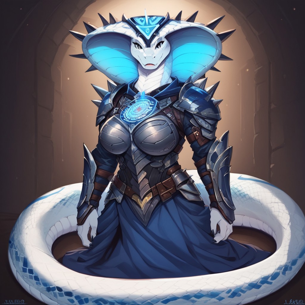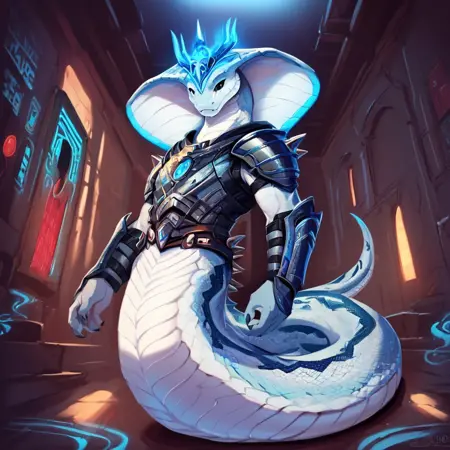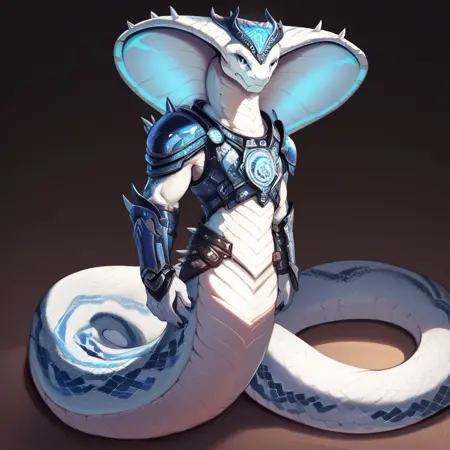 King viper,Draconcopode, snake,cobra,black eyes,muscular, white scales, blue accents,armor, headgear, hologram above head, spikes,