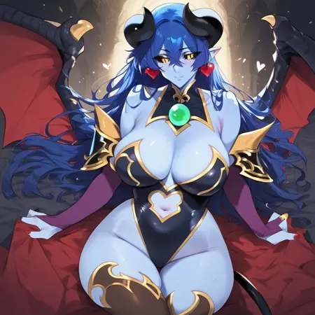 1소녀, 아스타로트, 악마 소녀, 긴 머리, 파란 피부, 검은 공막, 노란 눈, 악마 뿔, 뾰족한 귀, 신부 장갑, 보석, 꼬리, 귀걸이, 큰 가슴, 파란 머리, 악마 꼬리, 악마 날개, 하트 귀걸이, 레오타드, 하트 모양 배꼽 절개, 분리형 칼라, 허벅지 긴 양말,