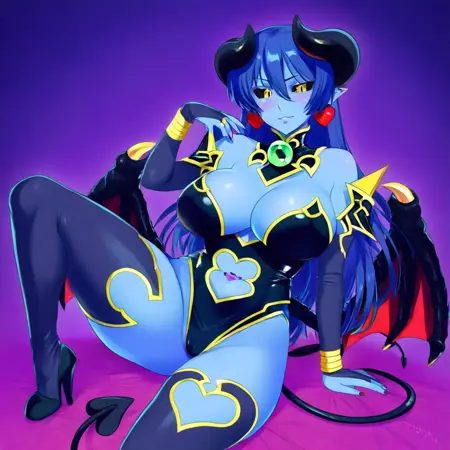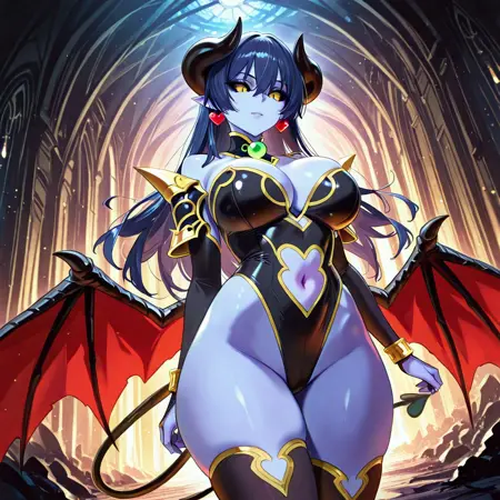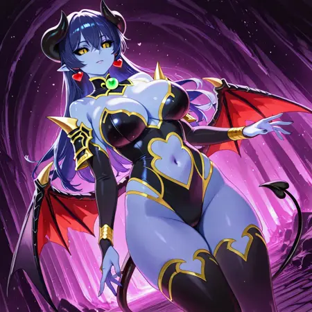 1girl,Astaroth ,demon girl, long hair, blue skin,black sclera, yellow eyes, demon horns, pointy ears,bridal gauntlets, jewelry, tail, earrings,large breasts, blue hair,demon tail,demon wings,heart earrings,leotard,heart navel cutout, detached collar, thighhighs,