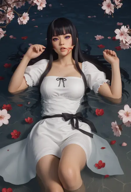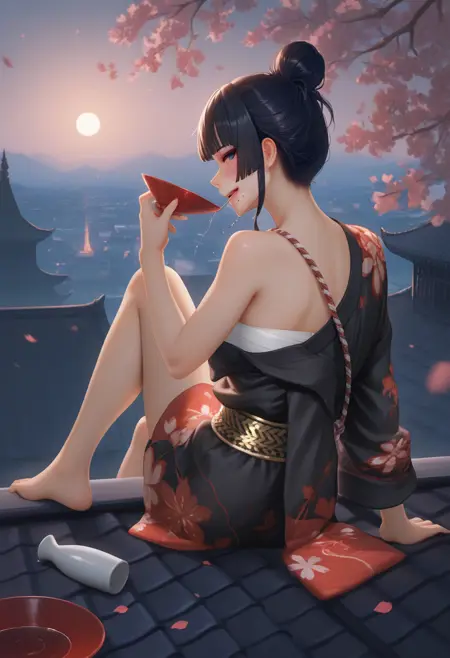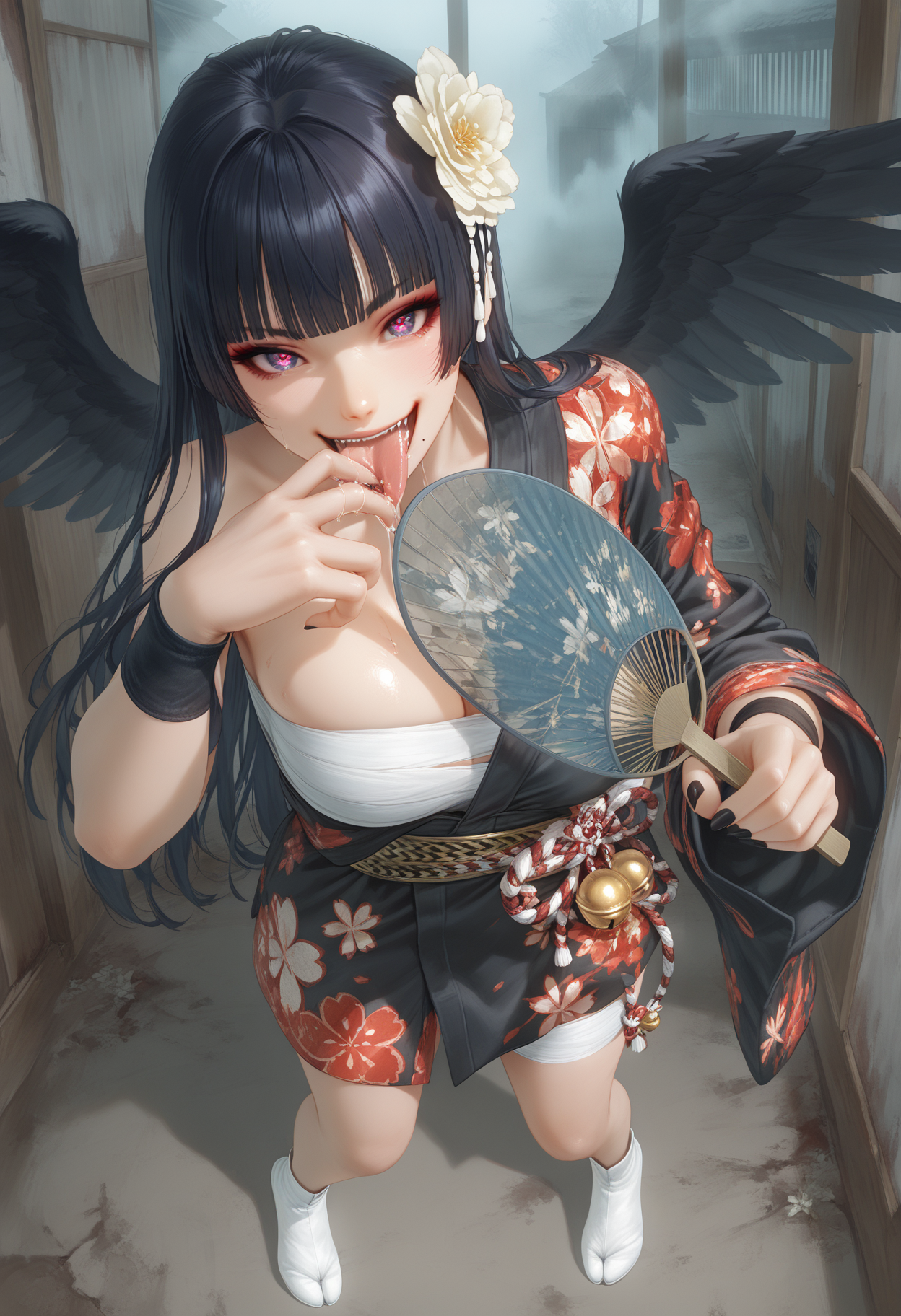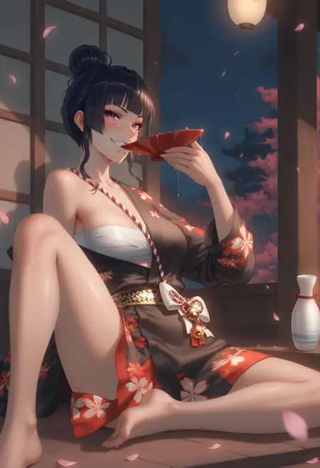 검은 키모노, 비대칭 단축 키모노, 한쪽 어깨 드러난 키모노, 붉은 꽃무늬 프린트 키모노, 오픈 키모노, 소매가 팔꿈치보다 긴, 한쪽 소매만 착용, 흰색 가슴 살사, 흰색 팬티, 빨간색과 흰색 밧줄, 빨간색과 흰색 허리 bows, 빨간색과 흰색 밧줄 bow, 작은 종, 금색 오비, 검은색 손목 밴드, 흰색 붕대 감은 허벅지, 흰색 타비, 한쪽 어깨 노출