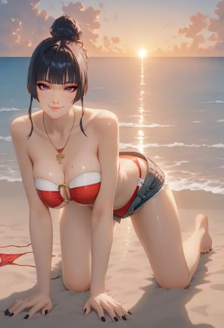 스트링 목걸이, 구슬 펜던트, 어깨 밴드 없이 착용하는 비키니, 흰색과 탄색 및 빨간색 어깨 밴드 비키니, O-링 비키니, 컷오프 반바지, 지퍼가 열린 반바지, 단추가 풀린 데님 반바지, 빨간색 하이레그 비키니 바지, 비키니 바지가 반바지 아래에 있음
