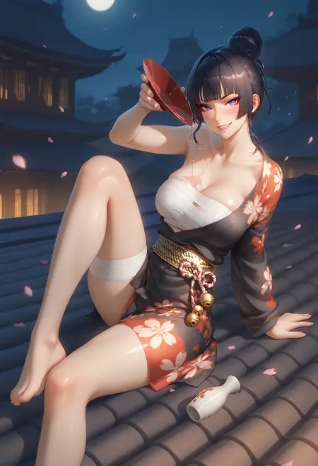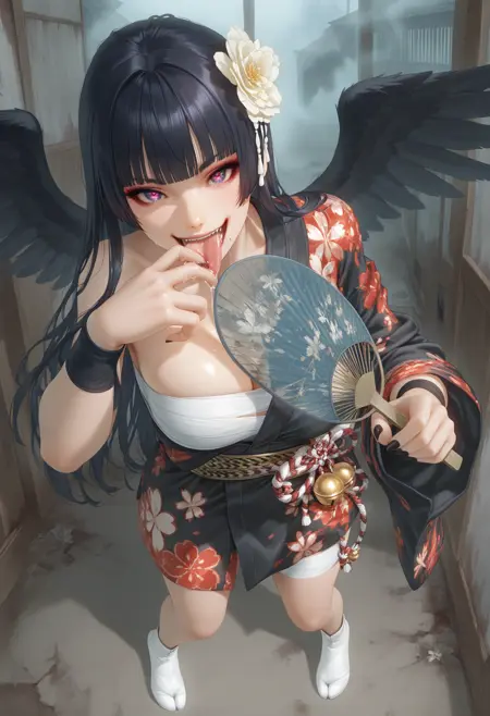 black kimono, asymmetrical short kimono, single off shoulder kimono, red floral print kimono, open kimono, sleeve past elbow, wear only one sleeve, white chest sarashi, white panties, red and white rope, red and white waist bow, red and white rope bow, jingle bells, gold obi, black wristband, white bandaged thighs, white tabi, single bare shoulder,