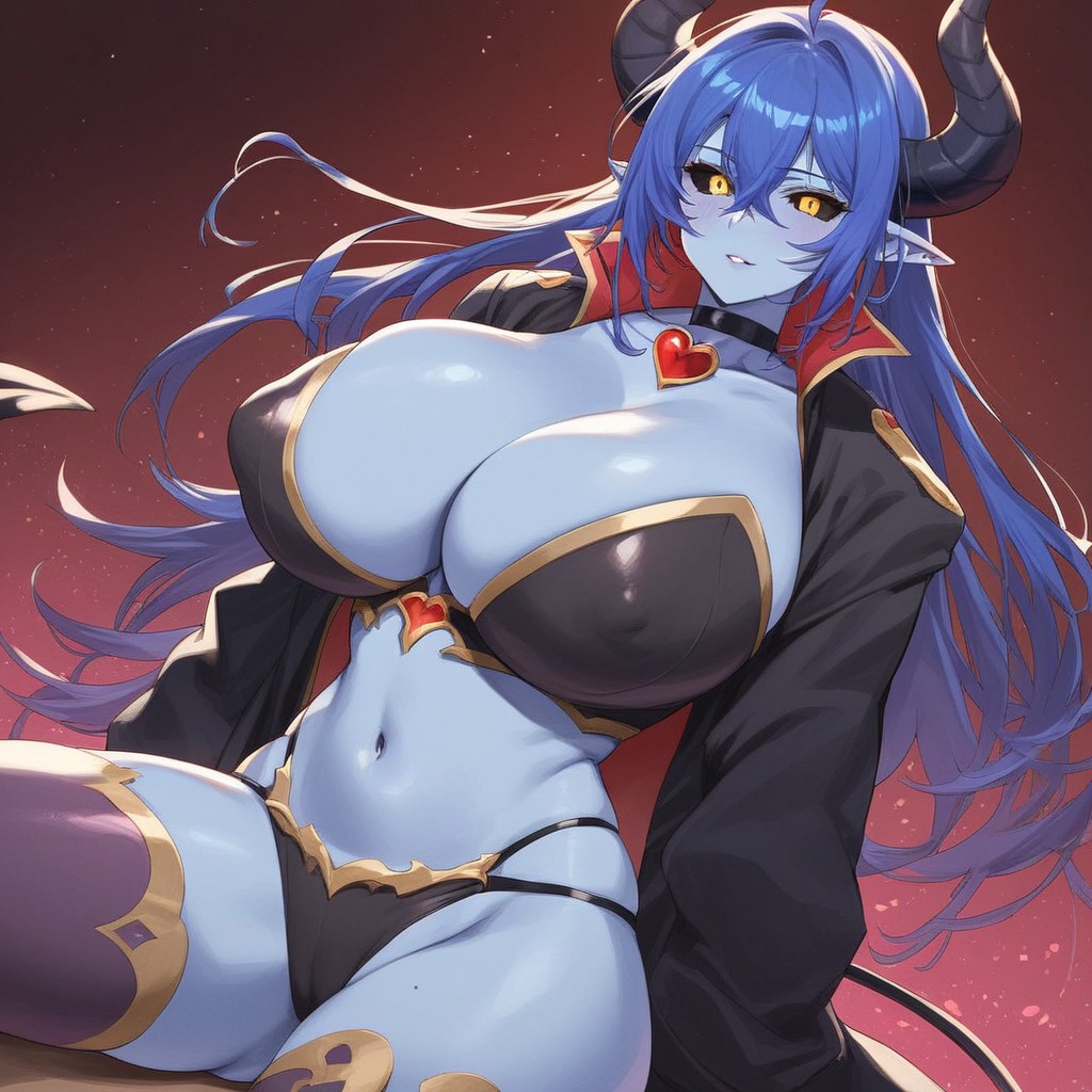 1girl, Asmodeus, 悪魔の少女, ミルフ, 黒い虹彩, 胸, 色付きの虹彩, 角, 青い肌, 色付きの肌, 青い髪, 黄色い目, 尖った耳, 大きな胸, 長い髪, 悪魔の尾, 胸元, へそ, 覆われた乳首, 悪魔の角, チョーカー, 黒いジャケット, レッグハイ, 非対称な服, 腹筋