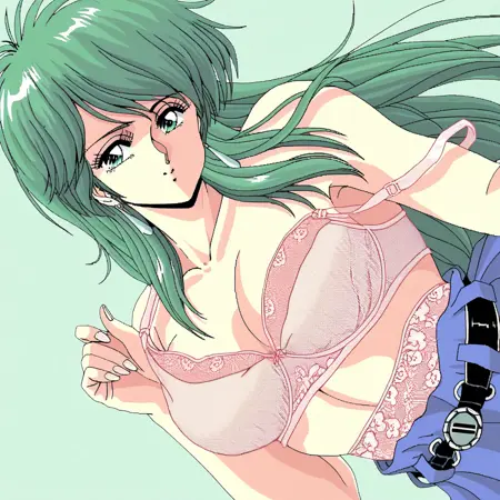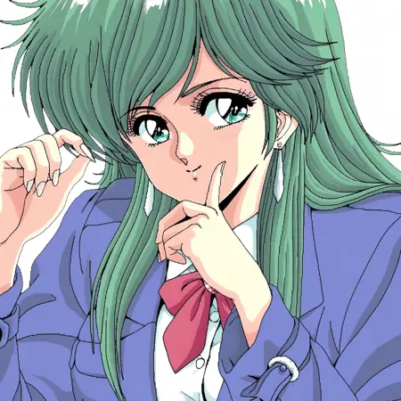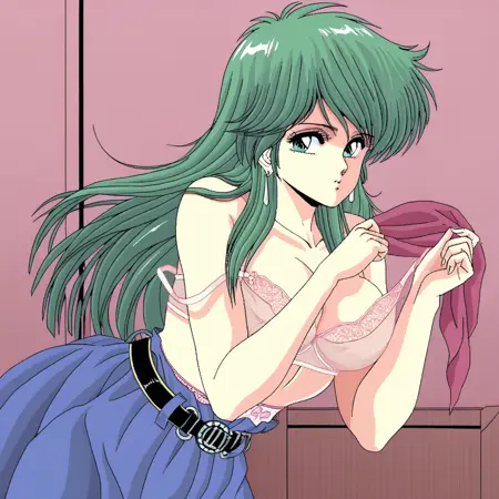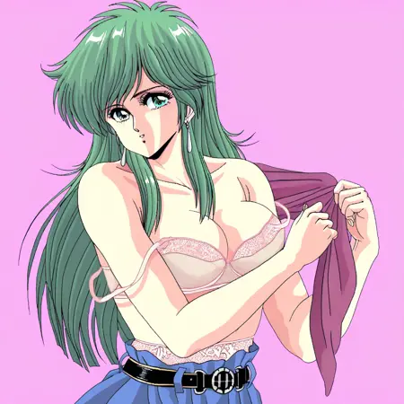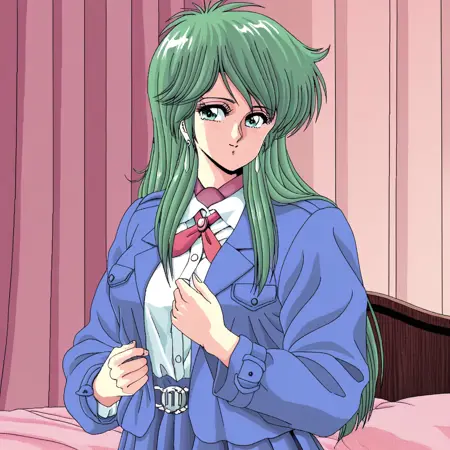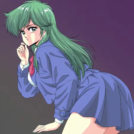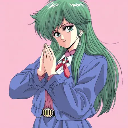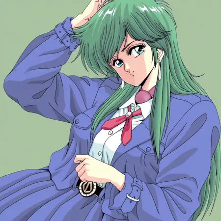트리거 단어: shgai,1girl,solo,long hair,green hair,green eyes,retro artstyle,1980s (style),